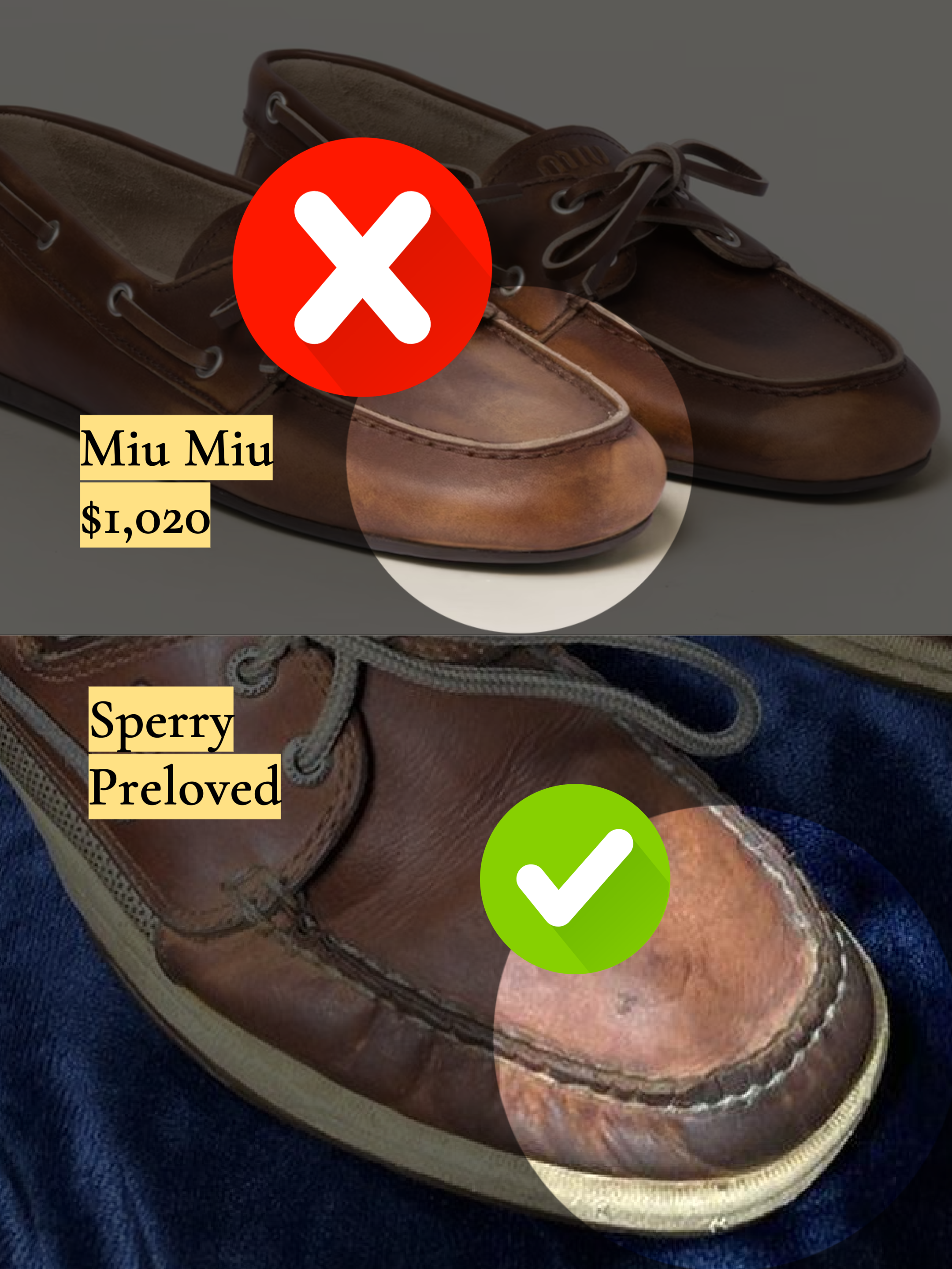 For genuine patina, you can find many pairs of vintage Sperrys on Depop for under $30. New Sperrys are under $200. I love many Miu Miu shoes, but these are a self own: expensive theater without structural truth.