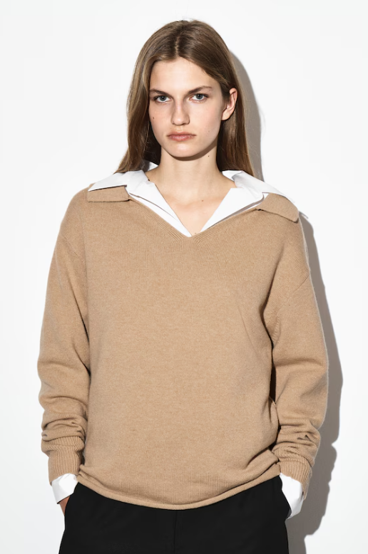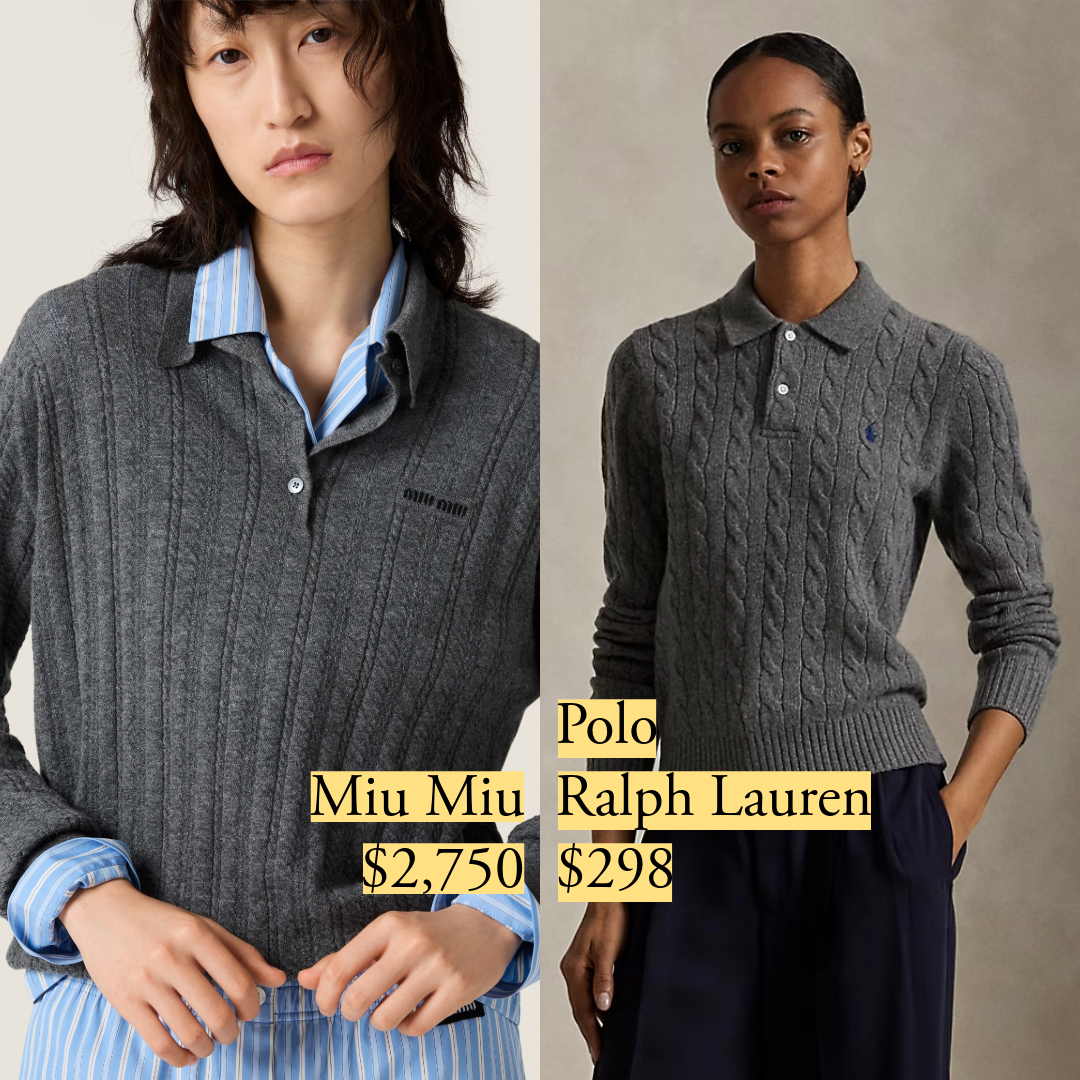 Update an older piece: Say you have a beloved oversized polo sweater, or one without buttons. For an easy update, layer your polo sweater over a crisp button-up shirt. Brands like Tory Burch, Cos, and Miu Miu are showing how this simple styling move transforms the polo from casual staple to refined essential. That's the power of opting for well-made pieces. You can keep refreshing them.
