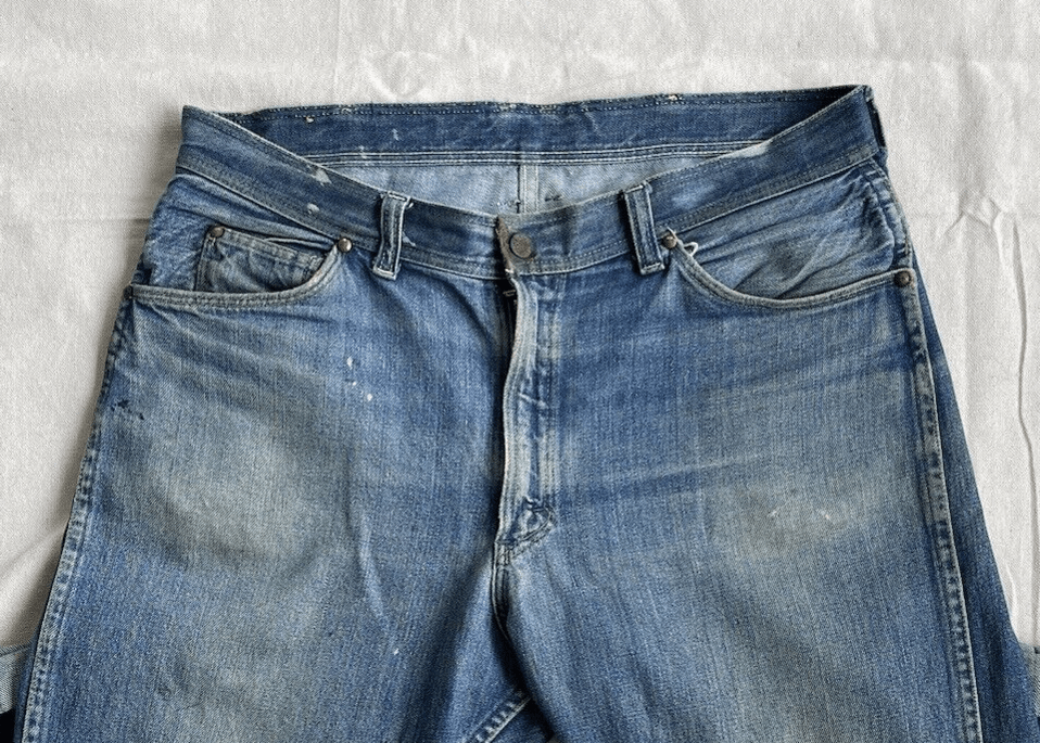 Your most used jeans will naturally develop this distressing, and we can see it in these vintage jeans. Look at the area below the pockets, straight across the jeans, from right to left. On your body, it's where your legs meet your hips.