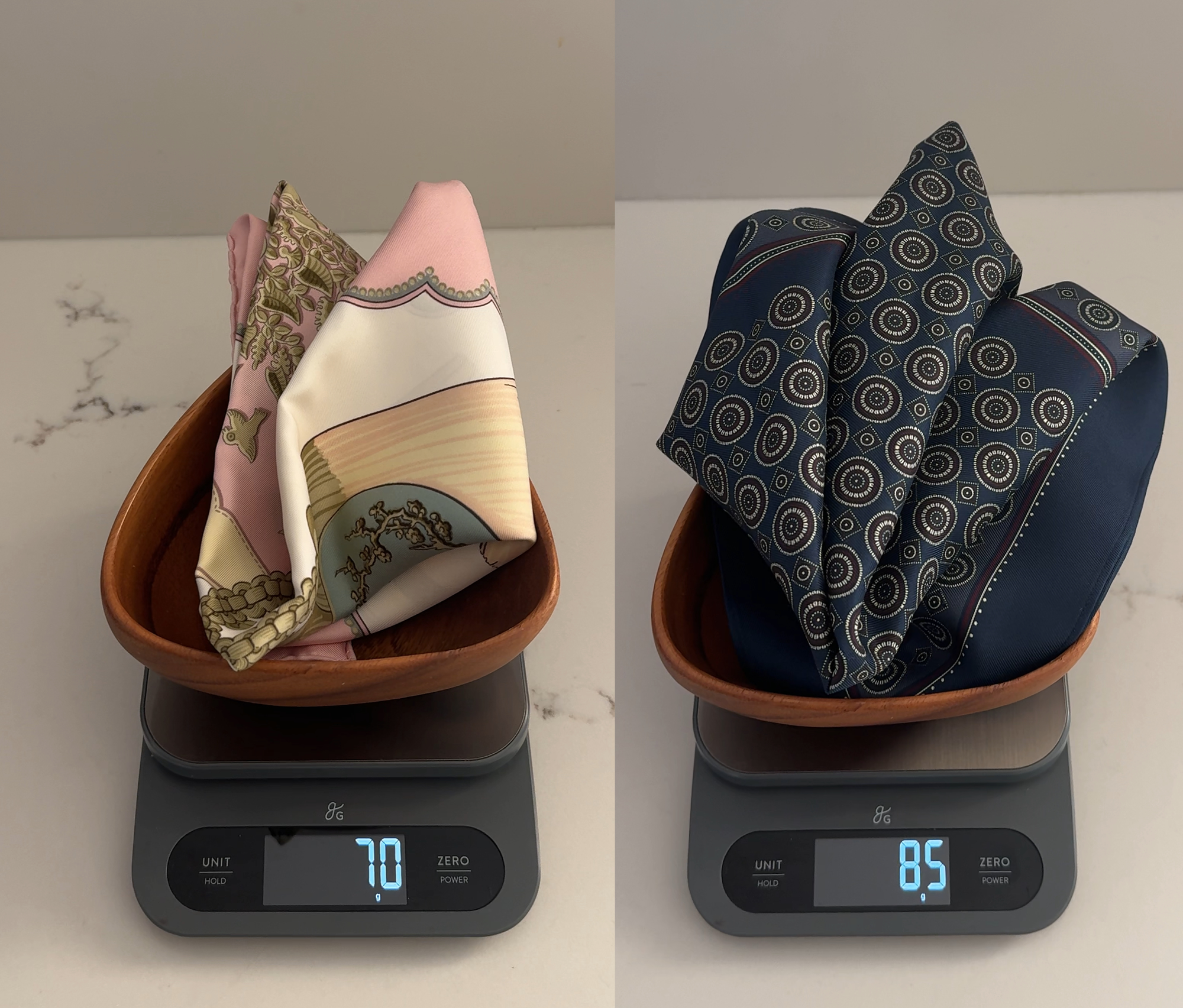 What the numbers mean in practice: a Hermès 90cm carré runs approximately 18-19 momme, noticeably heavier than mid-range scarves. My own Aritzia scarf weighed in at 24.2 momme, which is denser still. My vintage Dior, by contrast, came in at 12.5 momme – and the hand feel reflects that. Weight varies significantly by weave too: a chiffon will be lighter than a twill at the same size, by design. So momme is most useful as a comparison tool within similar constructions, not as an absolute score.