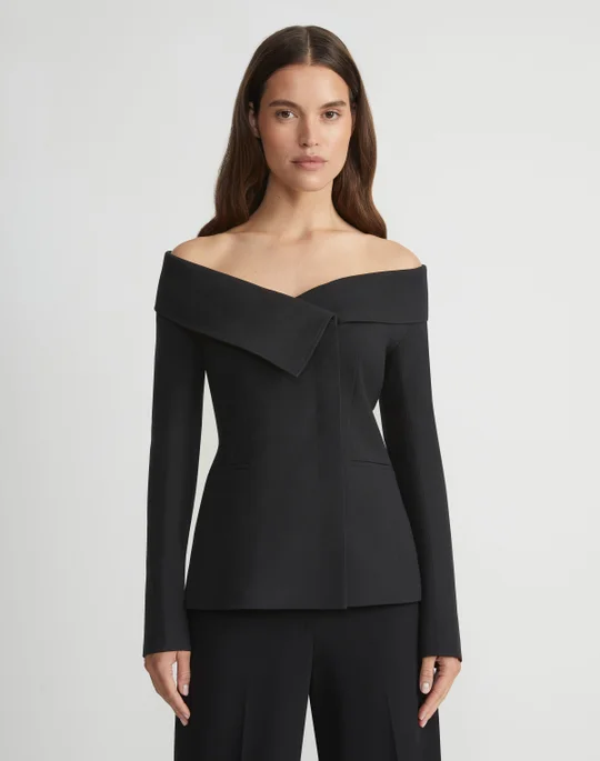 A portrait collar accompanies a portrait neckline, a wide V-neck with the edges of the V at the points of the shoulder rather than closer to the neck or off the shoulders. The collar itself can vary from a notched construction to a fold-over. With its more formal look, the portrait collar tends to go with cocktail and evening dresses and tops.