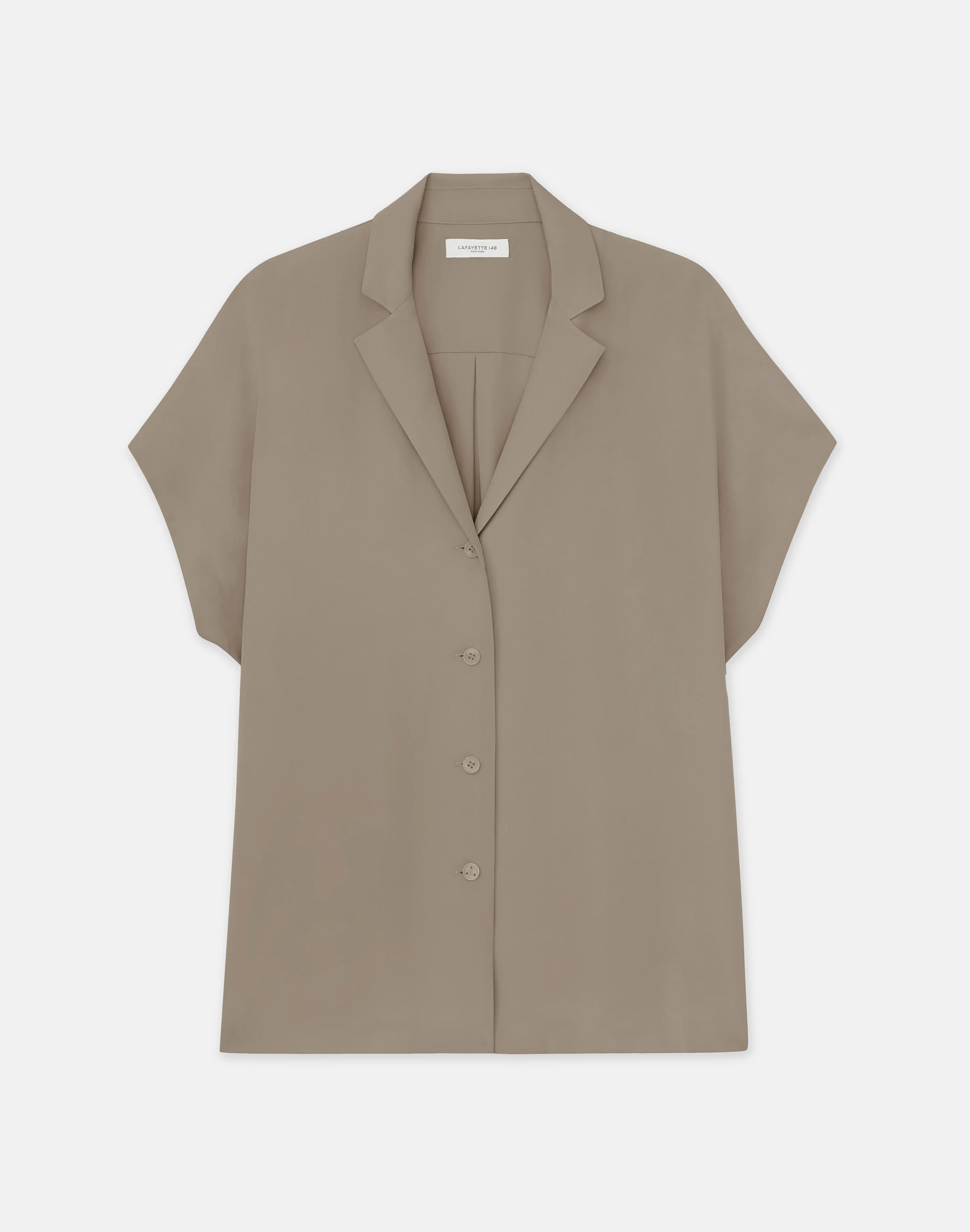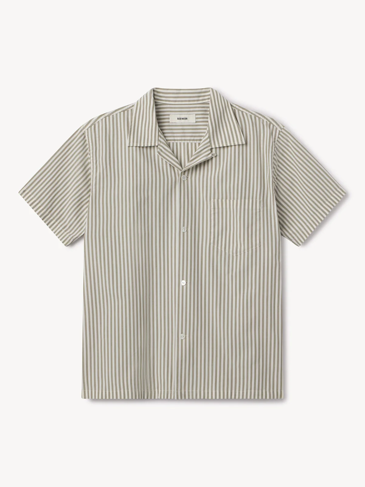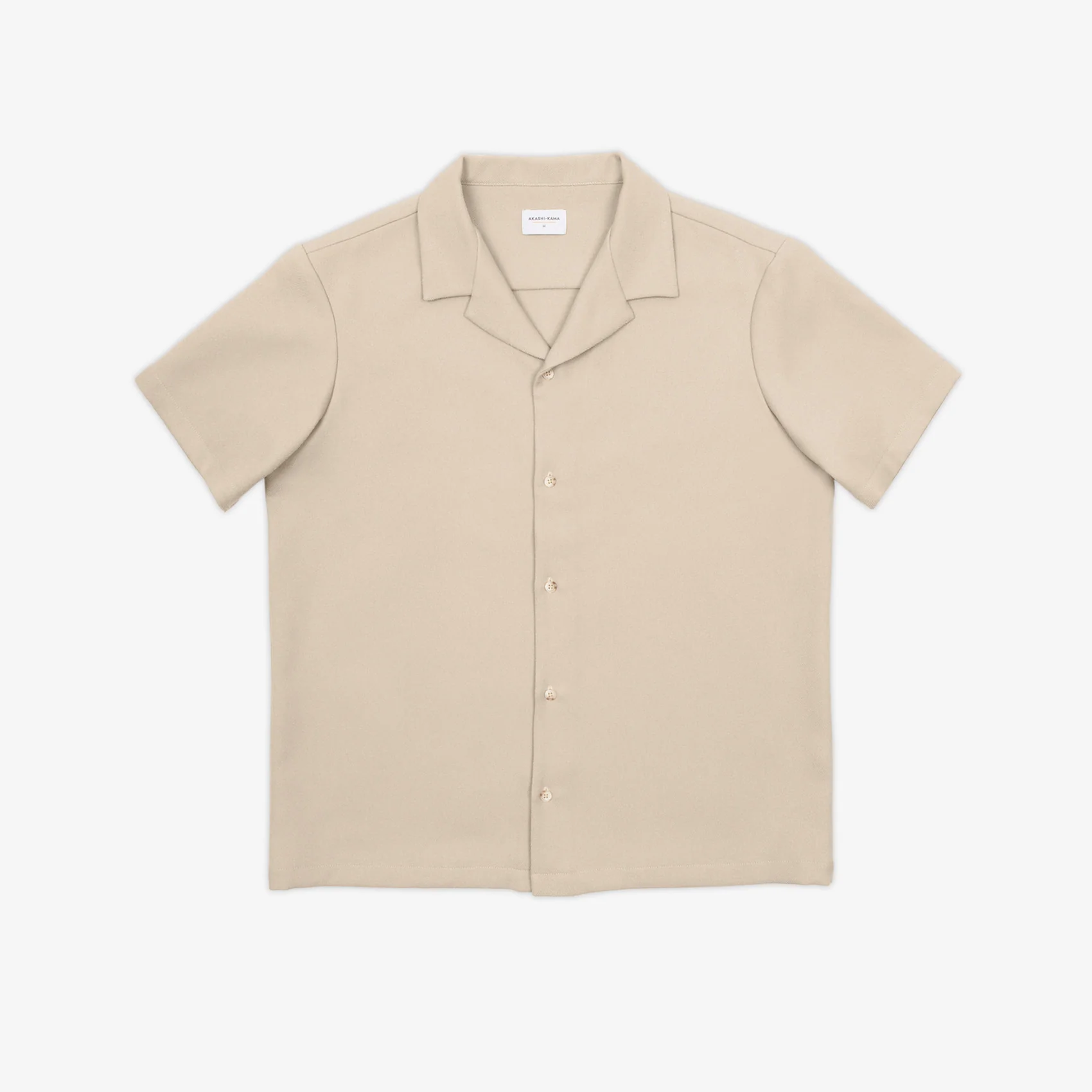 Popular now in 2024, the camp shirt draws from Cuban workwear of the 1900s and first gained widespread popularity in the United States in the 1950s. The collar lies flat and open at the neck. In fact, it has no stand; it continues the shirt front. The collar may appear on any silhouette, but a camp shirt in particular has a boxy silhouette and short sleeves.