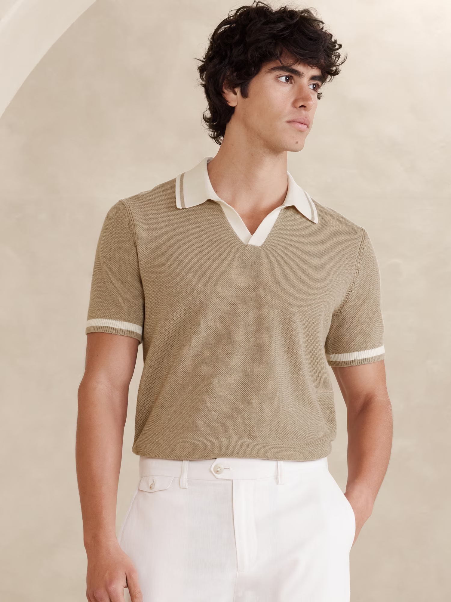 A Johnny collar, also known as a golf collar, is a soft, rounded collar that's typically smaller and less formal than a standard dress shirt collar. It tends to look more relaxed and sporty, at home with casual or smart casual looks, and it's usually fabricated in more casual fabrics, including knits.