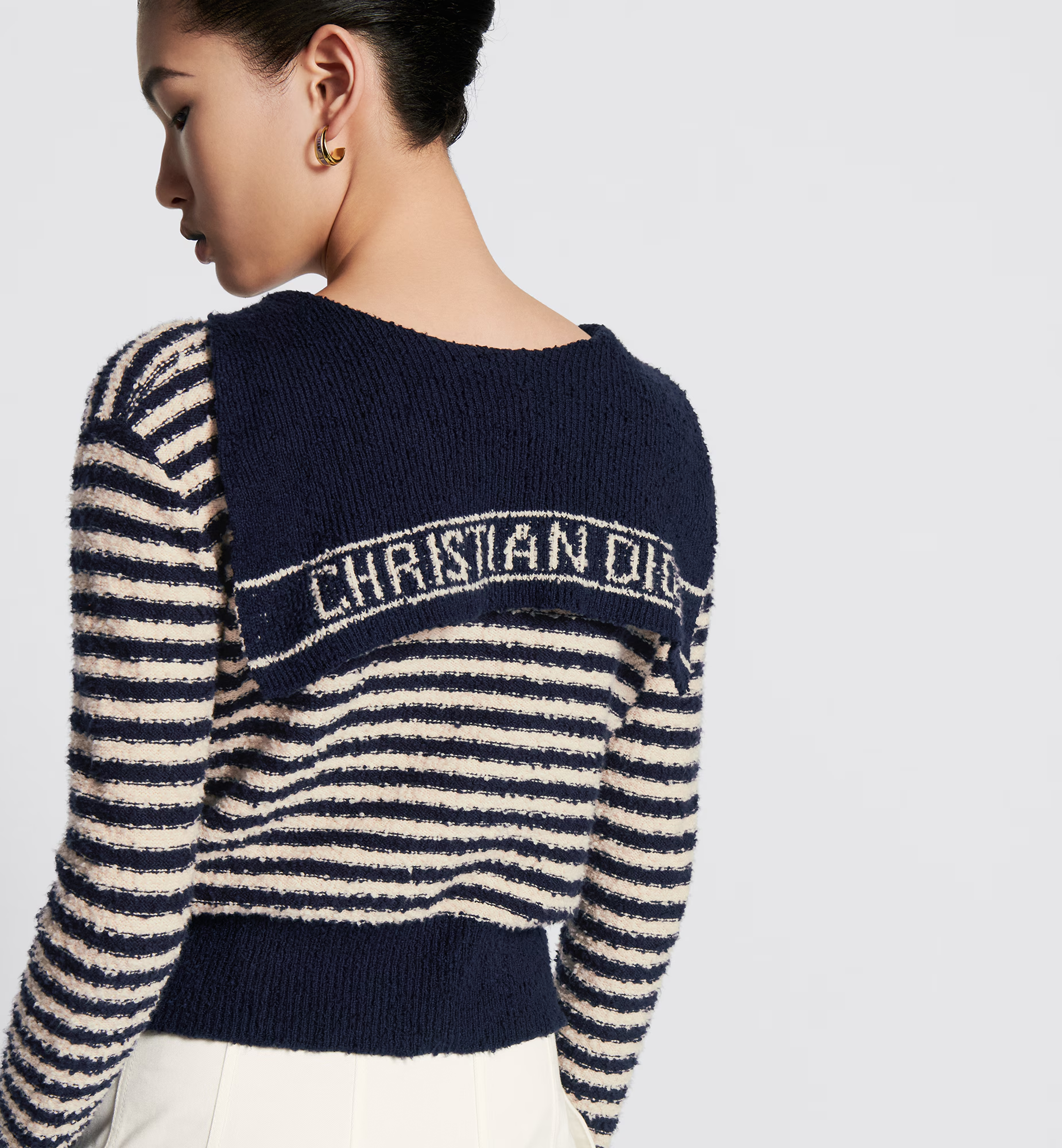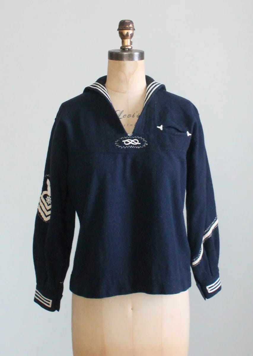 U.S. Navy middy shirts from the early 20th century inspire the middy or sailor collar, with its distinctive rectangular panel in the back. Even though the extra fabric was designed to provide protection from the sun, it has evolved to take on a decorative connotation alone, lending it more of a kitschy vibe than that of other collars inspired by military uniforms.