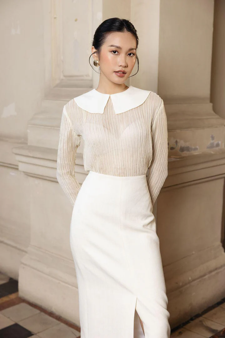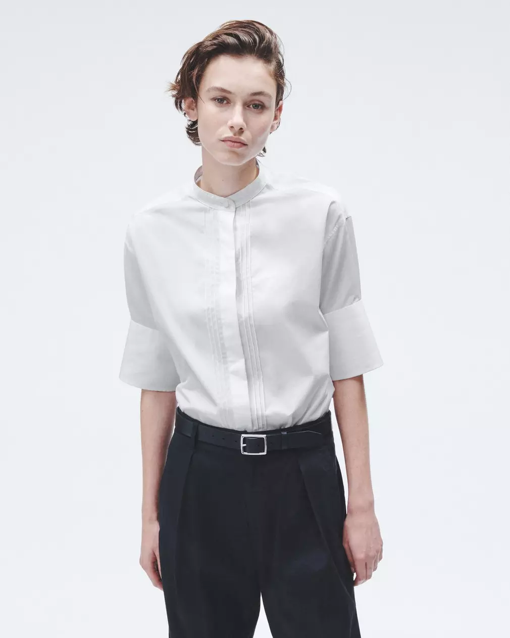 In 2024, maintaining a large white collar is a form of luxury, and the Puritan collar can be a high fashion look, seen in the Carolina Herrera shirt below. It can also take on an exaggerated childlike quality, out-Manic Pixie-ing even a Peter Pan collar, seen in the second look.