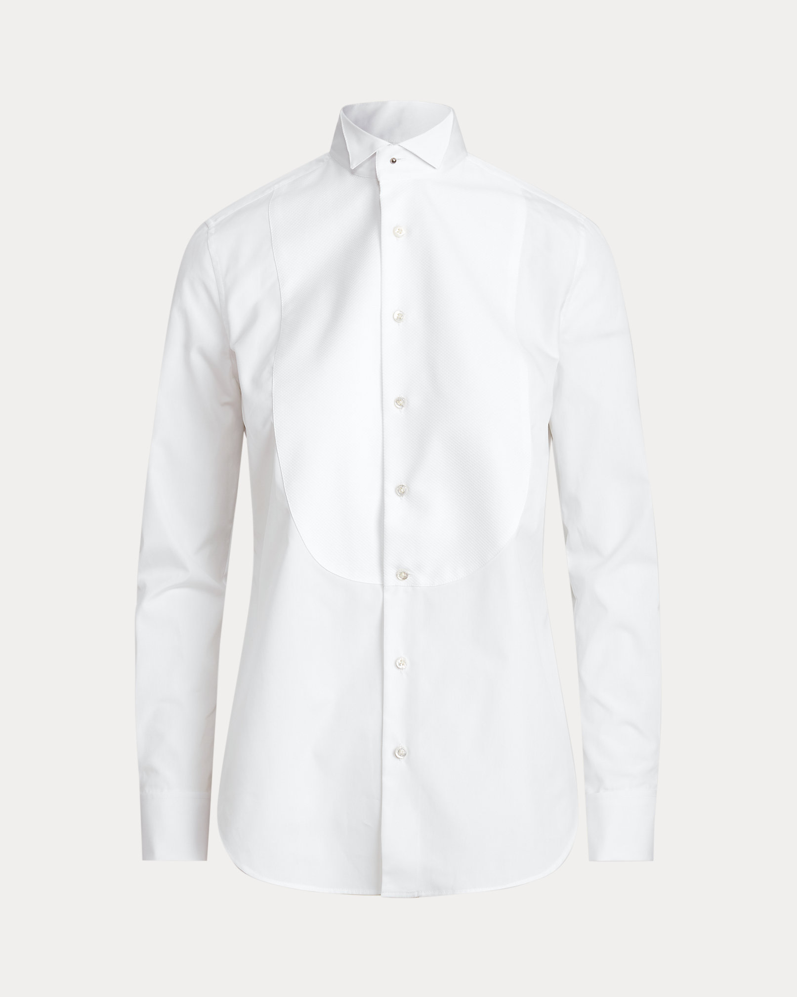 The wingtip collar also features a wide space between the points, and it's perfect for bow ties. The collar itself is really short, stiff, and formal. It's commonly used for shirts that pair with tuxedos and often has a collar stud at the neck, as does this Ralph Lauren shirt: