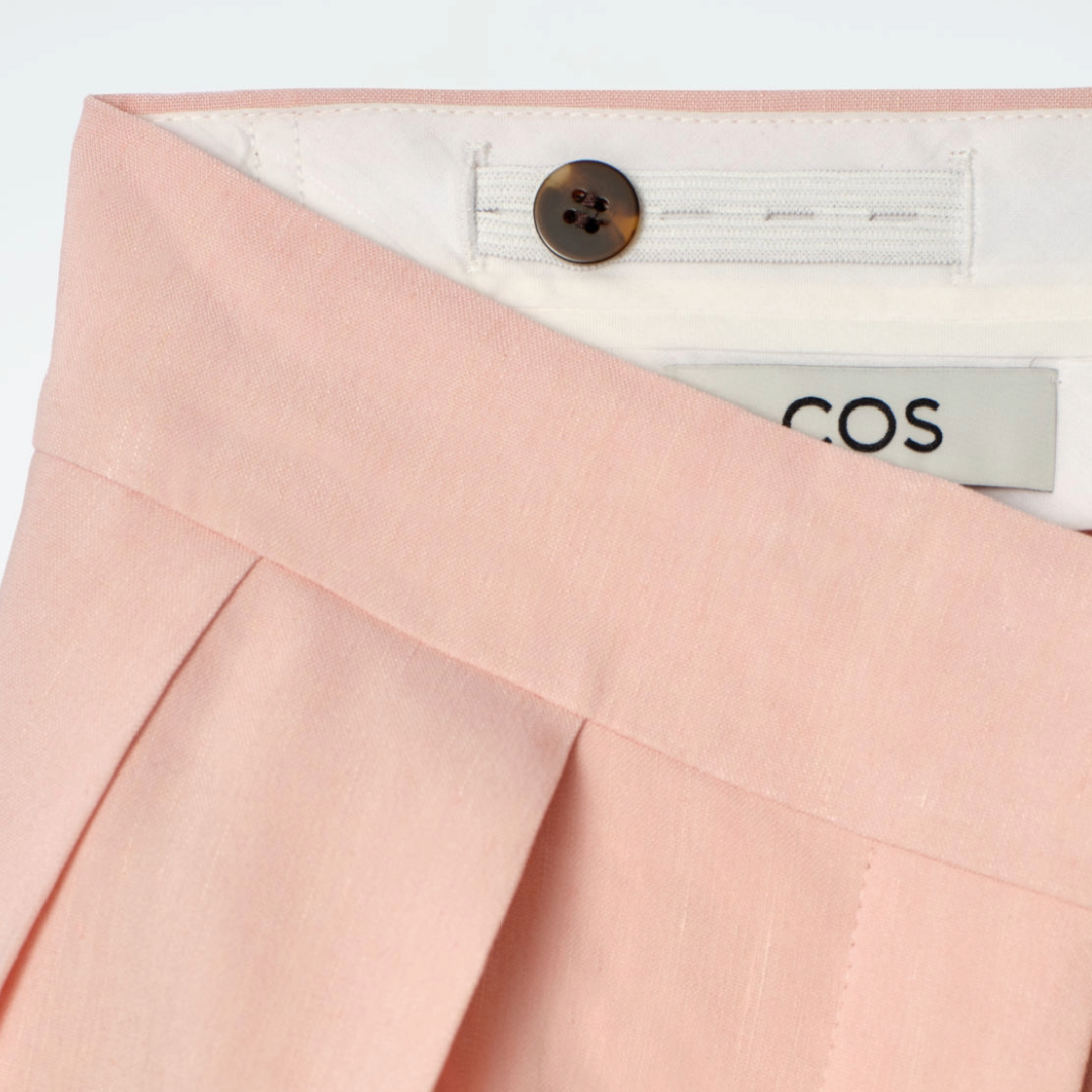 Seam allowance visible on the hung pants, rear elastic on the cream pants, and Cos' adjustable inner elastic