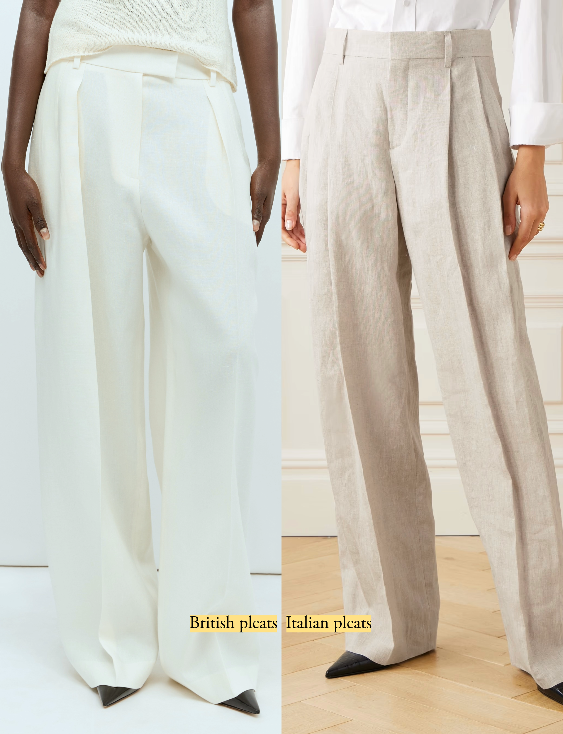 Pleats communicate formality. Italian-style pleats that open away from the center create a long, clean line in the center of the body, while British-style pleats opening toward center read more traditional.