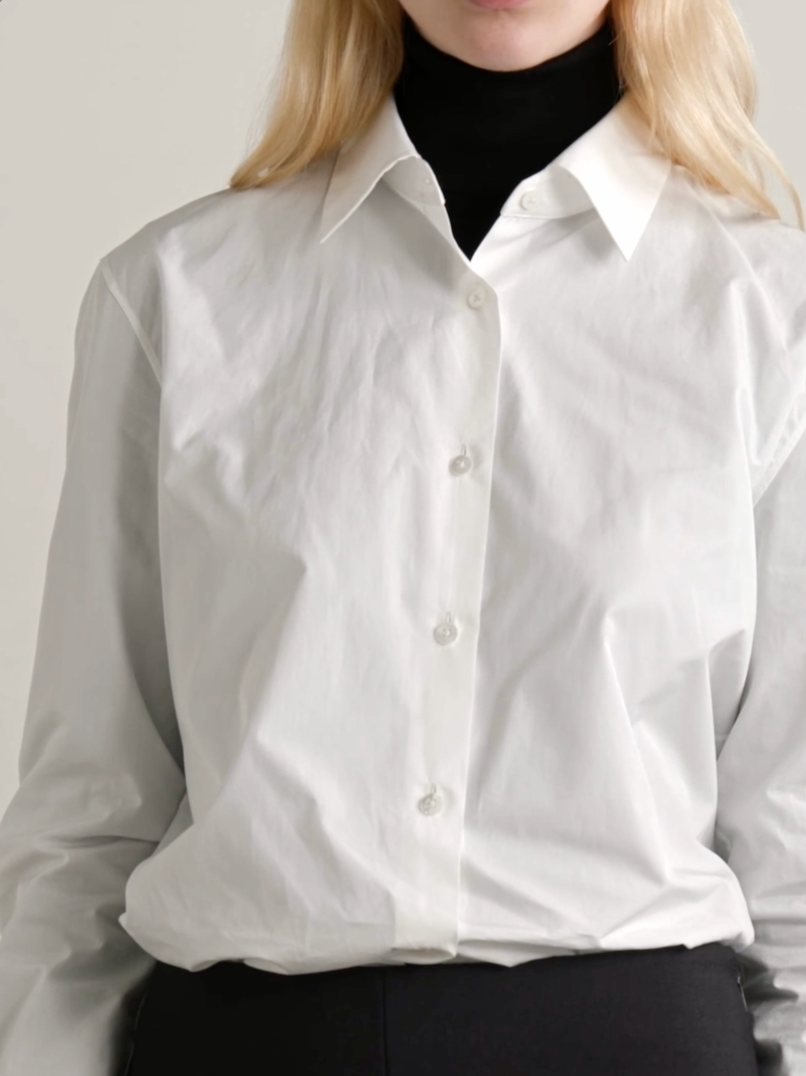 The Row's gorgeous Maigret shirt ends up looking lumpy when styled atop the turtleneck above. Even smooth fabrics with fluid drape can end up missing the mark if they're worn on top of grippy layers. See my video and Net-a-Porter's product video for what to avoid when you're layering.