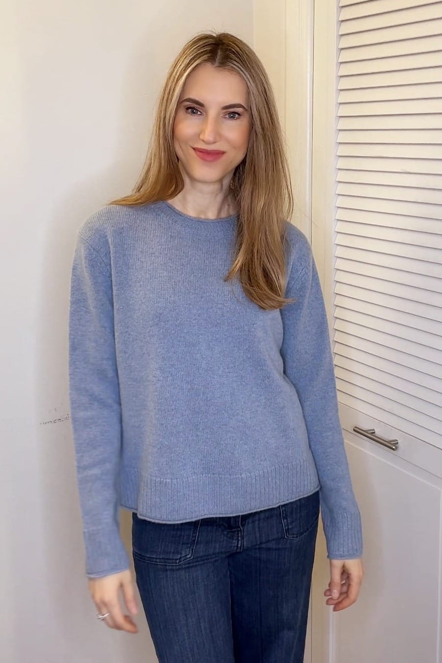 While the $50 crewneck is not my favorite, Quince's Mongolian Cashmere Boxy Crewneck Sweater delivers thoughtful design through careful details. The rolled edges and split waistband elevate the piece well beyond its modest price tag. While the color selection is limited to six options, they do include my favorite understated color of 2024: denim blue. Quince uses Grade A cashmere, so the sweater is very soft. This is the rare affordable luxury that doesn't feel like a compromise.