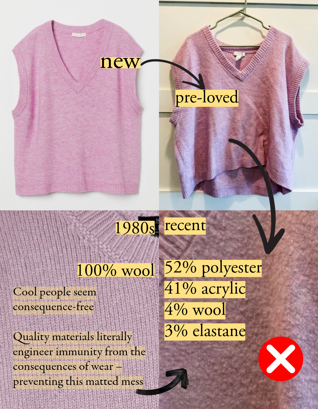 The Polyester Trap: That trendy H&M vest might look appealing in-store, but after a few wears, the polyester fibers mat and pill. Far from consequence-free, it emphasizes the costs of mundane events like subway turnstile encounters and laundry. The opposite of cool.