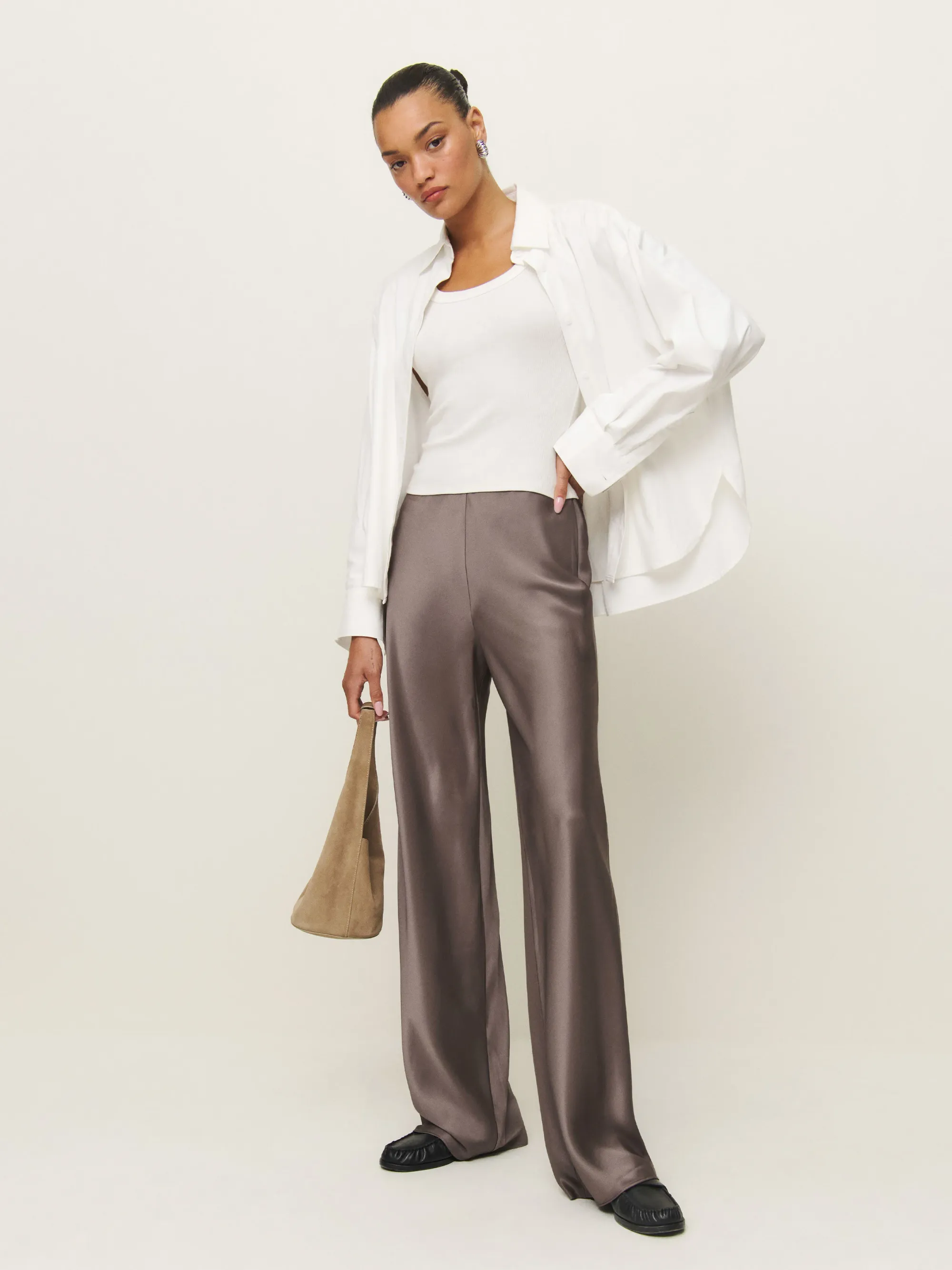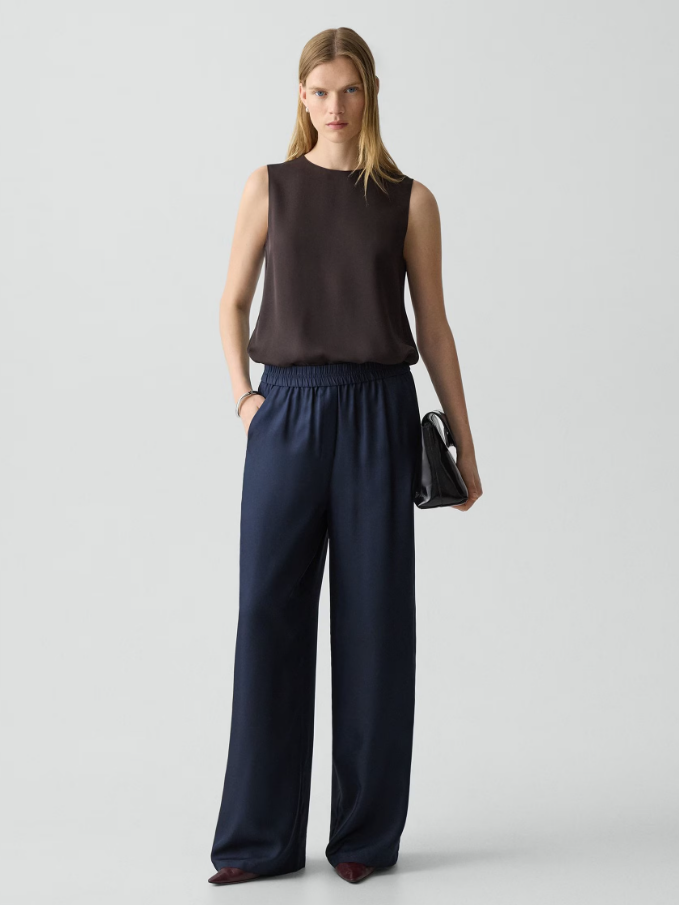 - Theory's silk twill pants ($295, often on sale) – Real silk with a twill weave that's exponentially more durable than satin, while still giving you that fluid drape and subtle sheen