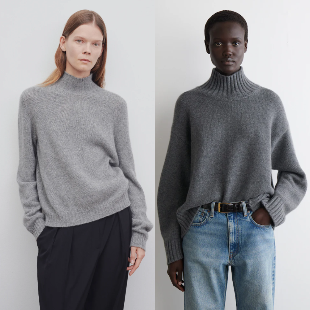 COS remains the best high-street cashmere with a smooth surface and rich handfeel. Their $399 funnel neck compares to The Row in styling, and I consistently see their stores' display pieces looking fresh after being handled by countless customers. The raised detail along the shoulders and slanted seams along the bodice are more refined than many luxury alternatives. Fair warning: they sell out and rarely go on sale. I wanted to recommend their $250 crewneck, and it's completely out of stock.