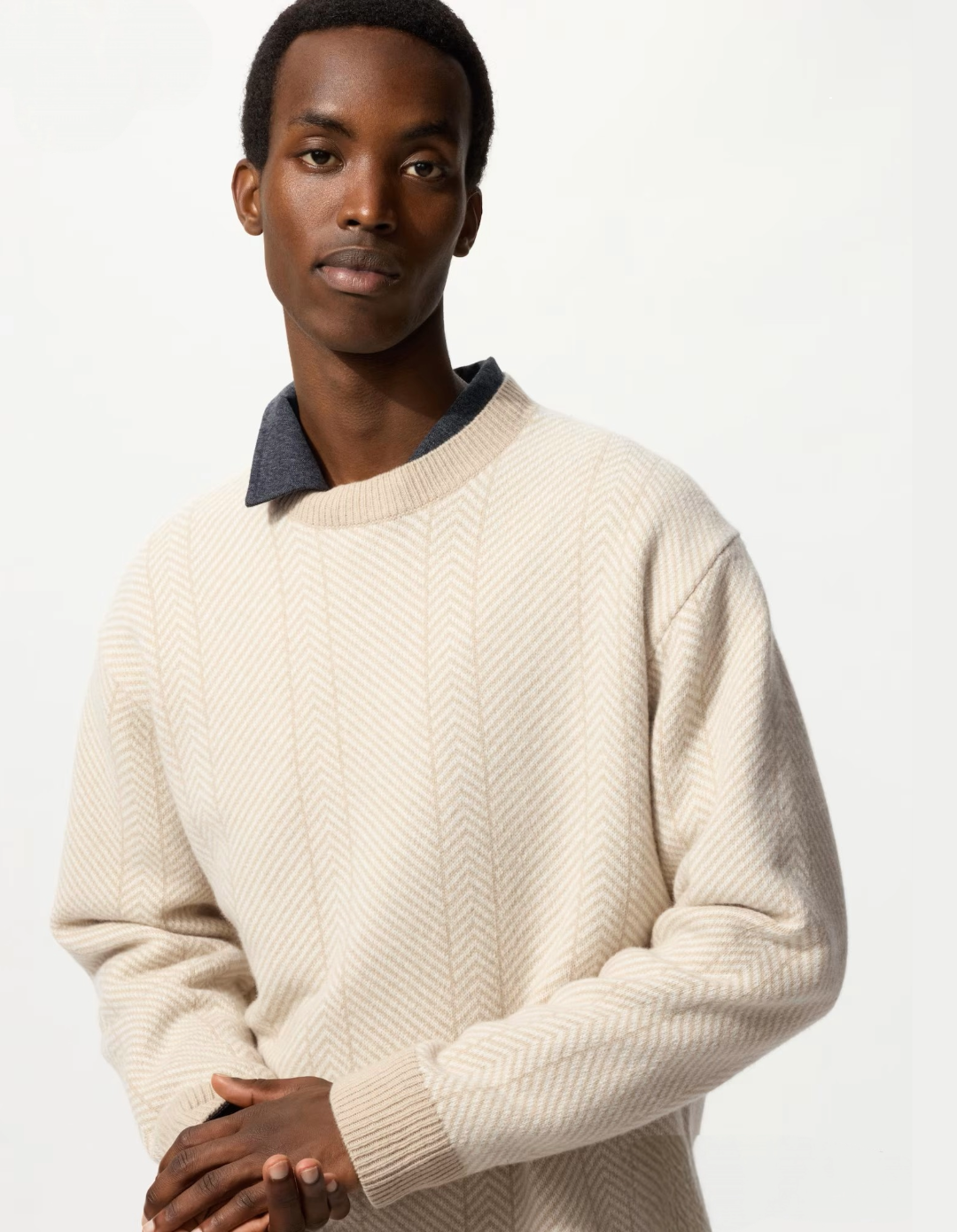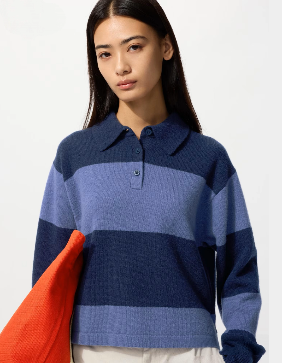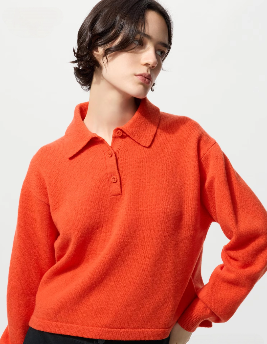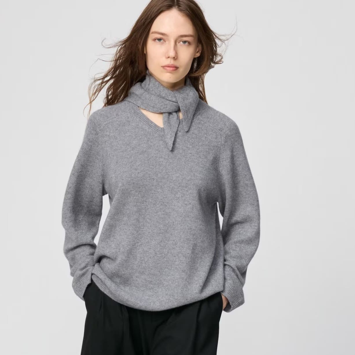 Uniqlo's lambswool is smooth, and the collars have that extra length and presence for a fashion-forward look. These echo Miu Miu's proportions at a fraction of the cost. The herringbone version ($60) appears to be a double-faced knit, which holds its structure beautifully, though the cut might be bulky for some.